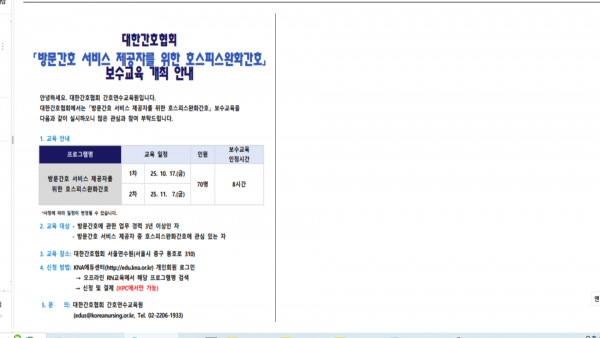 「방문간호 서비스 제공자를 위한 호스피스완화간호」보수교육 과정 개최 안내